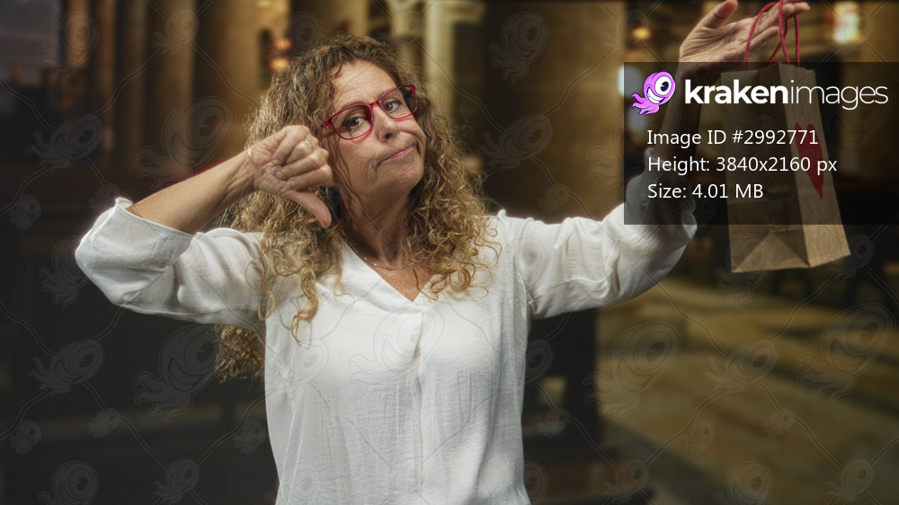Woman middle aged hispanic wearing red glasses holding a brown paper gift bag with a red heart and showing thumb down gesture in a church; disapproval refusal. - Kraken Images