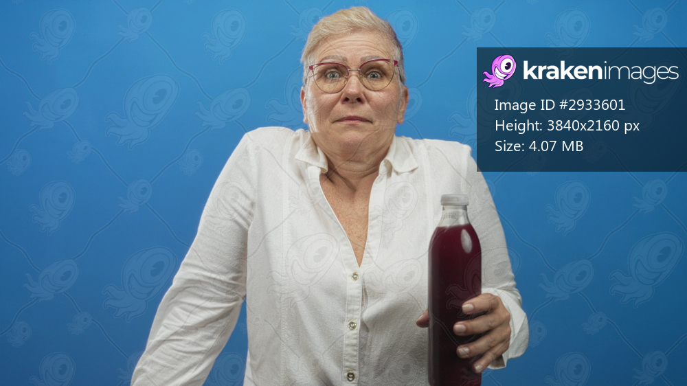 Woman middle aged holding a tall dark bottle and shrugging shoulders in a blue studio setting; uncertainty.