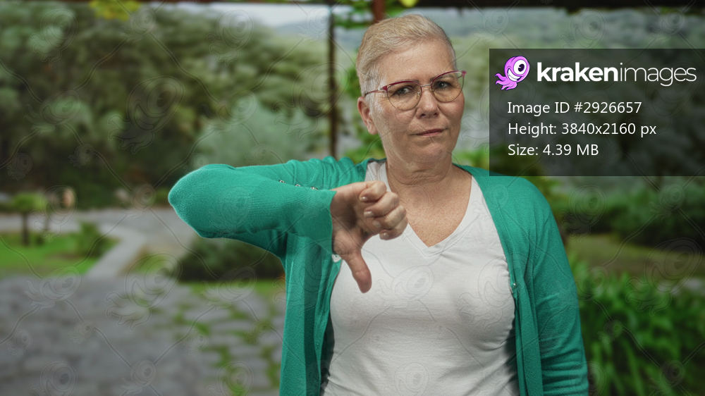Woman middle aged showing thumbs down gesture in park wearing green cardigan and white tshirt and glasses; disapproval.