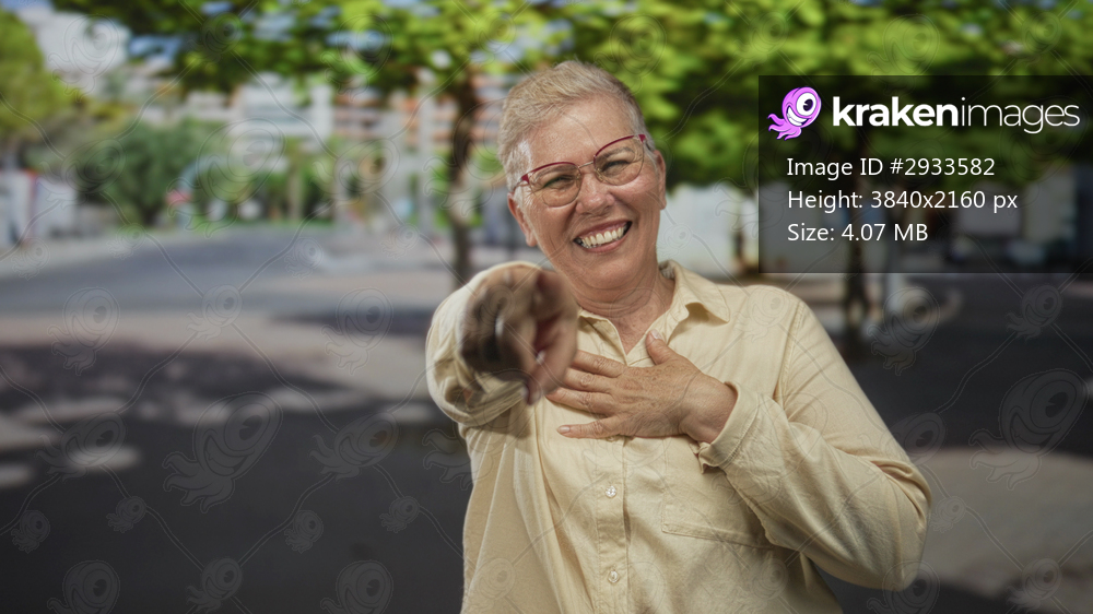 Woman middle aged smiling with hands clasped and pointing finger at camera on sunny city street wearing glasses; joy connection.