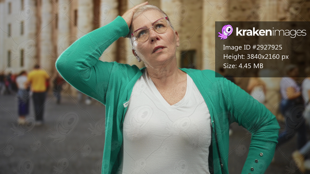 Woman middle aged touching temple with hand, wearing glasses and white t shirt, standing on old town street near stone building facades; fatigue travel. - Kraken Images
