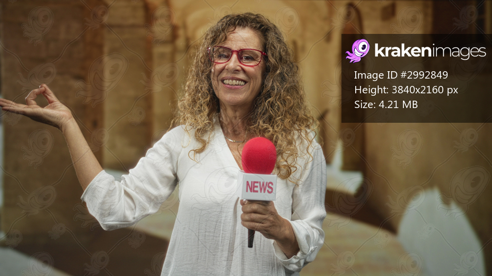 Woman middleage reporter holding red microphone labeled news, left hand forming ok sign and smiling in studio set with arched corridor backdrop; confidence trust. - Kraken Images