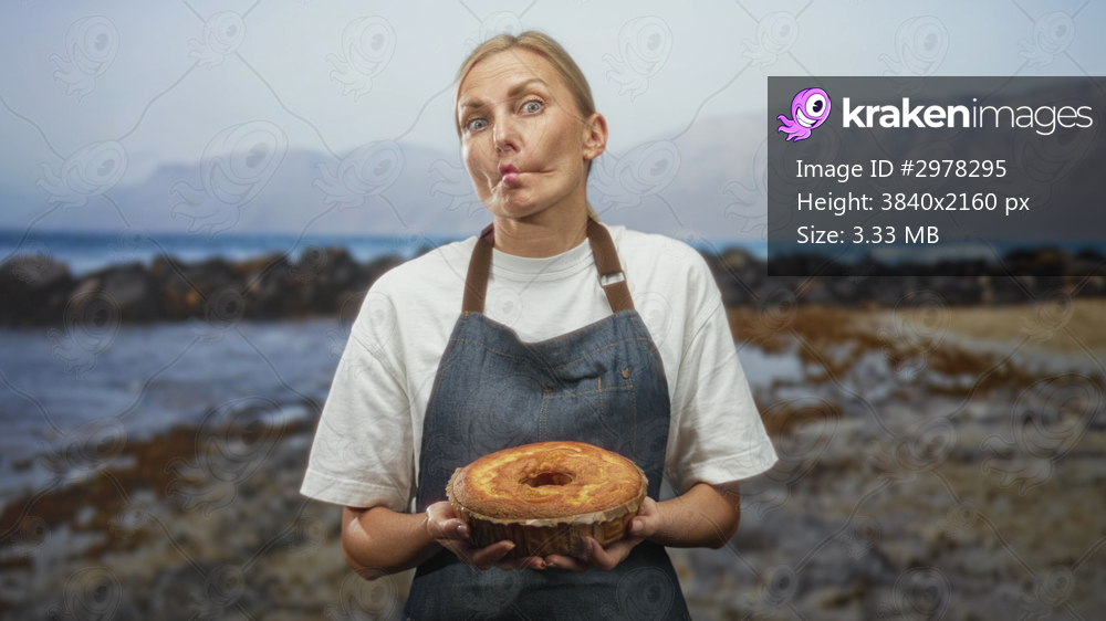 Woman middleaged blonde in apron holding sponge cake with puckered lips on a studio set with coastal backdrop; playful delight.