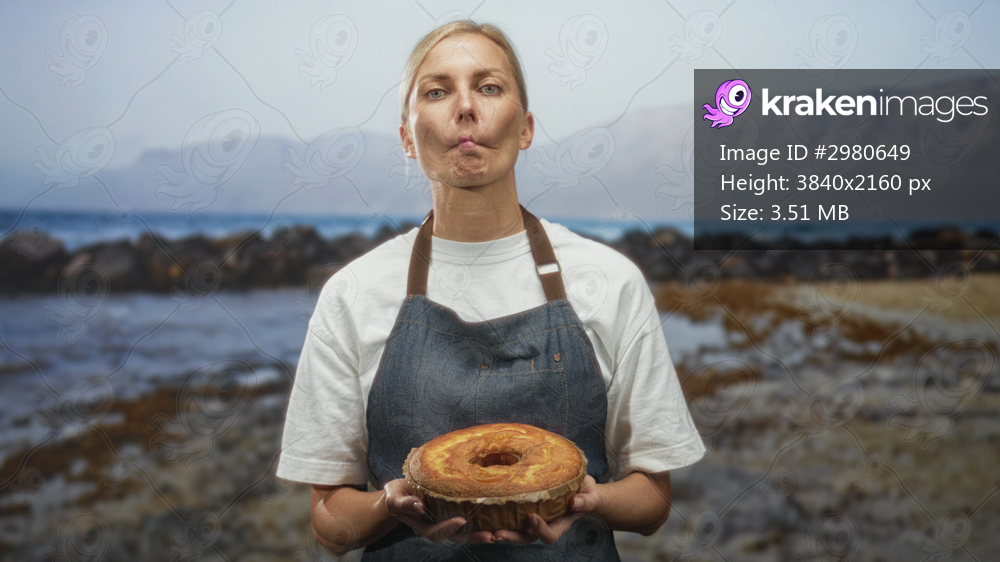 Woman middleaged blonde in apron holding sponge cake with puckered lips on a studio set with coastal backdrop; playful delight.