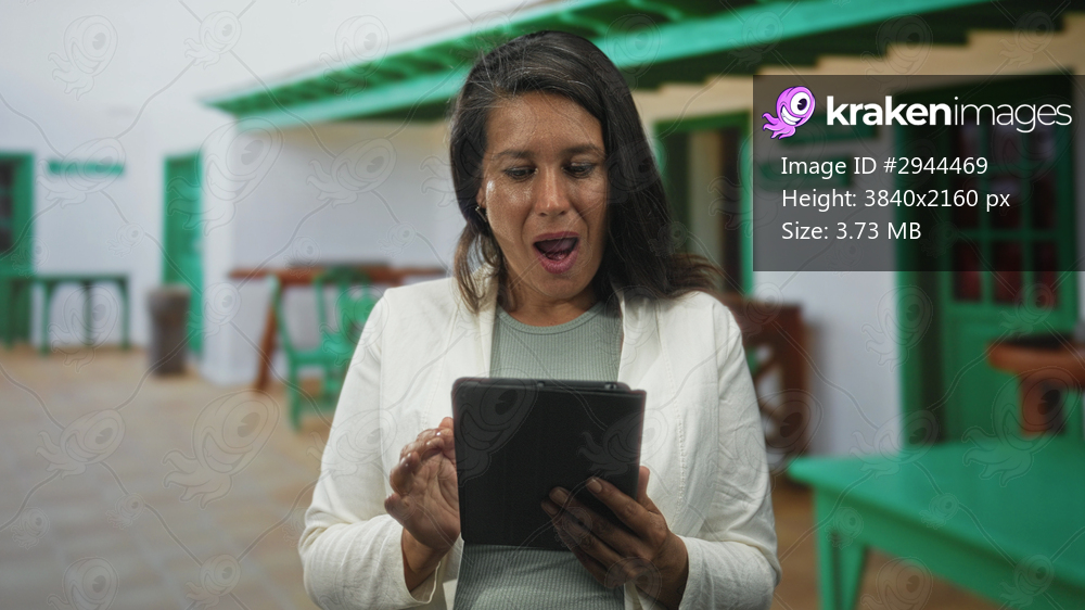 Woman middleaged brunette reading a tablet, hands touching screen and holding device by green doors of a small building; surprise curiosity.