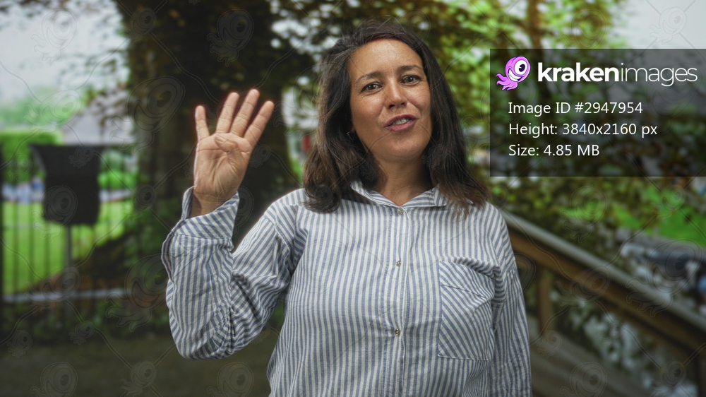 Woman middleaged hispanic brunette waving right hand with palm visible at building entrance, smiling in a striped button shirt; friendly greeting.