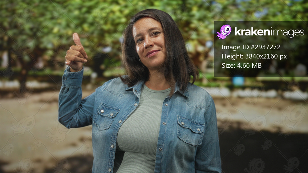 Woman middleaged hispanic brunette wearing denim shirt with hand making shaka sign in forest setting; friendly casual confidence.