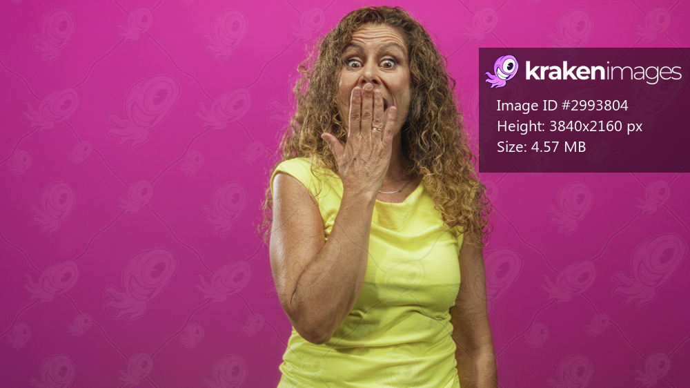 Woman middleaged hispanic laughing with hand covering mouth in studio against bright magenta backdrop wearing yellow sleeveless top and ring; joy warmth. - Kraken Images