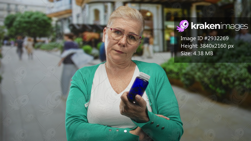 Woman middleaged holding blue medicine bottle, reading label with arms crossed on city street; concern hesitation.