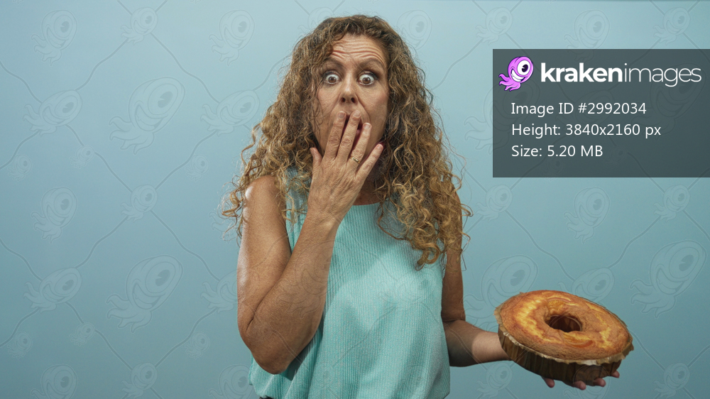 Woman middleaged holds a sponge cake in one hand while pressing fingers to lips and looking sideways in studio; hesitation curiosity.
