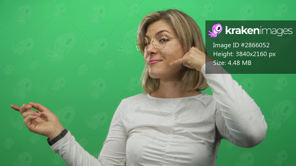 Woman miming phone gesture with hand and pointing finger in studio against green screen, wearing glasses and white shirt; playful.