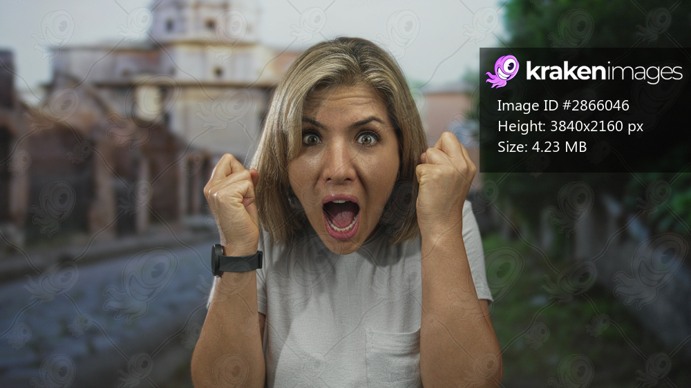 Woman with mouth agape raising both hands and screaming on cobblestone street in front of old building; shock.