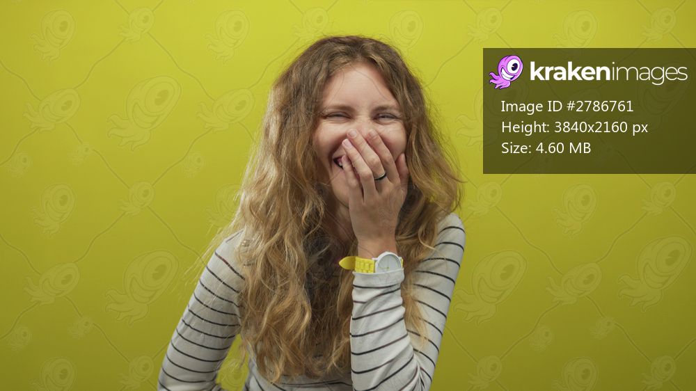 Woman mouth laughing studio blonde young subject wearing striped green watch casual attire.