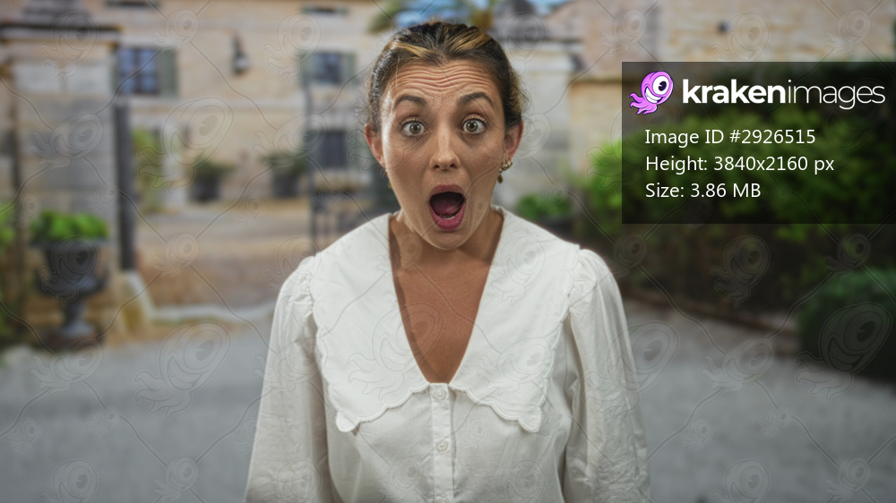 Woman mouth open gasp in front of stone building courtyard outdoors wearing white blouse; surprise discovery.