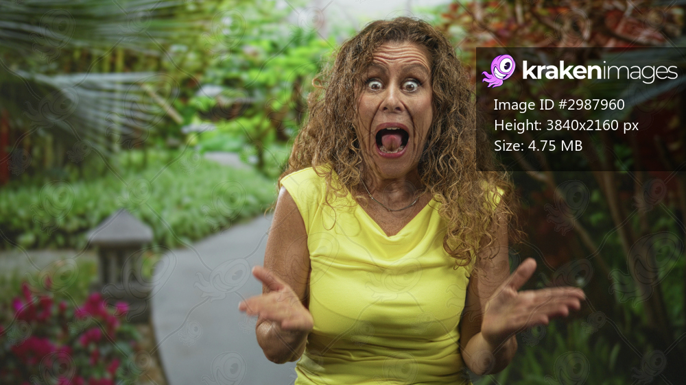 Woman with mouth open and hands raised, wearing yellow shirt and necklace, curly hair, standing on a street garden path with stone lantern and flowers; surprise. - Kraken Images