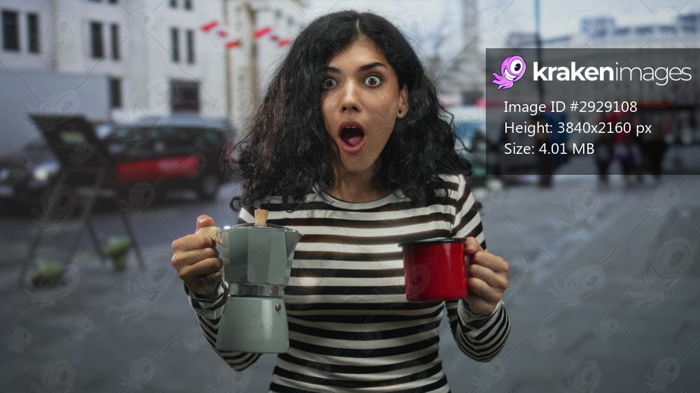 Woman with mouth open holding moka pot and red mug on a city street with delivery vans and building facades; surprise coffee moment.