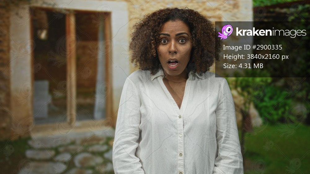 Woman with mouth open and wide eyes in shock at building entrance, standing by doorway outdoors in front of stone steps; alarm.