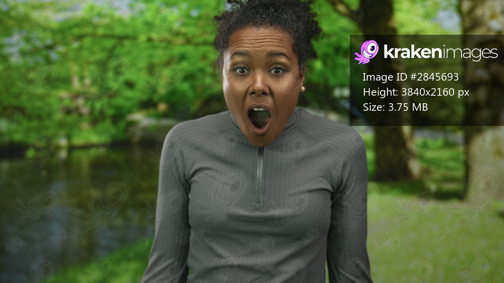 Woman mouth opens wide with raised eyebrows in forest pond setting under sunlit trees near calm water edge; surprise.