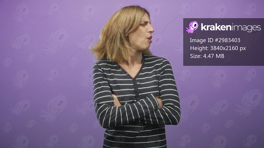 Woman with mouth puckered and arms crossed, head turned and hair in motion, wearing striped top against purple studio backdrop; dismissal annoyance.