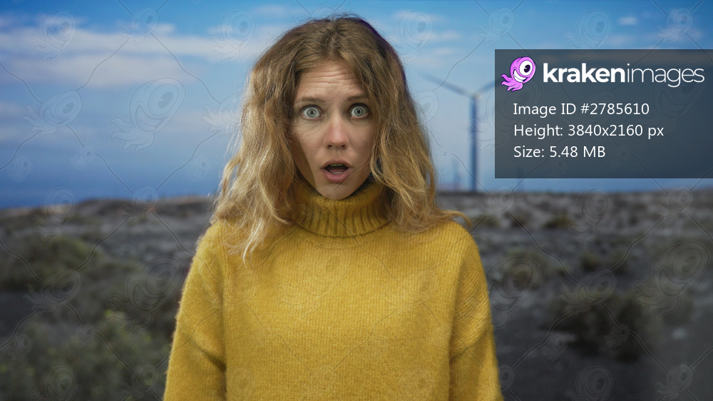 Woman mouth surprised windfarm blonde young expression wide eyes sky evokes drama.