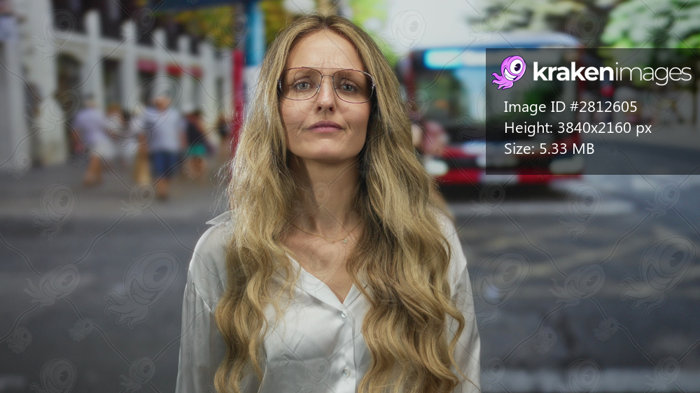 Woman with mouth wide open calling on street, young blonde outdoors urban commuter wearing glasses hails bus.