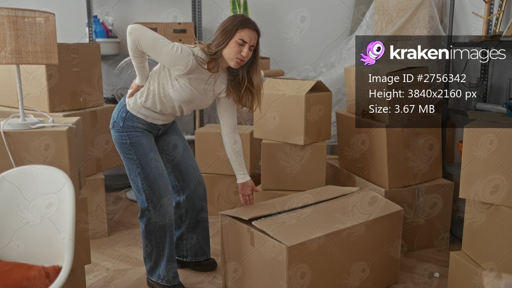 Woman moving boxes in new home injures back while unpacking indoors surrounded by cardboard boxes and furniture in modern living space demonstrating home relocation effort. - Kraken Images