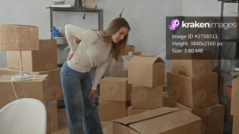 Woman moving boxes in new home injures back while unpacking indoors surrounded by cardboard boxes and furniture in modern living space demonstrating home relocation effort. - Kraken Images