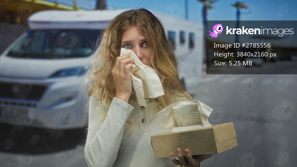 Woman nose crying street blonde tissue box sad tears outdoor moment.