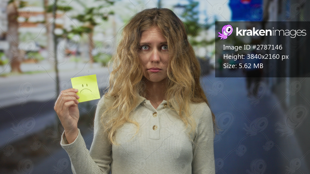 Woman note holding street blonde young sad face urban outdoor background highlights emotional isolation.