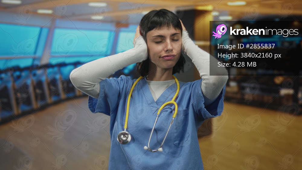 Woman nurse covering ears with hands in spacious indoor gymnasium by treadmills; sensory overload frustration.