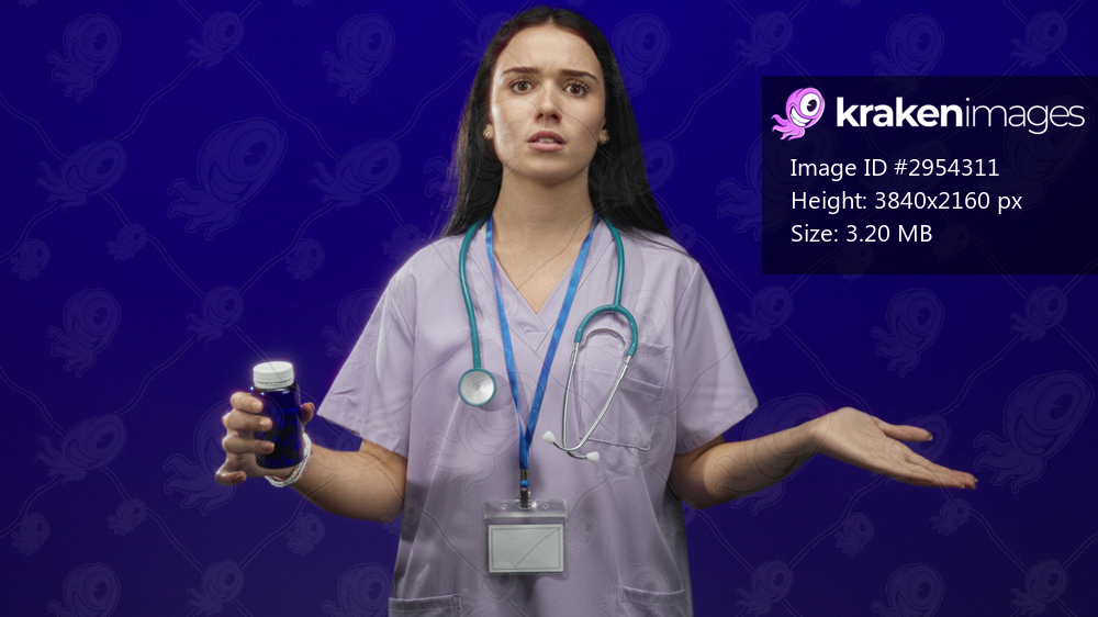 Woman nurse holding pill bottle with palms up gesture, stethoscope visible, puzzled expression in studio; concern uncertainty.