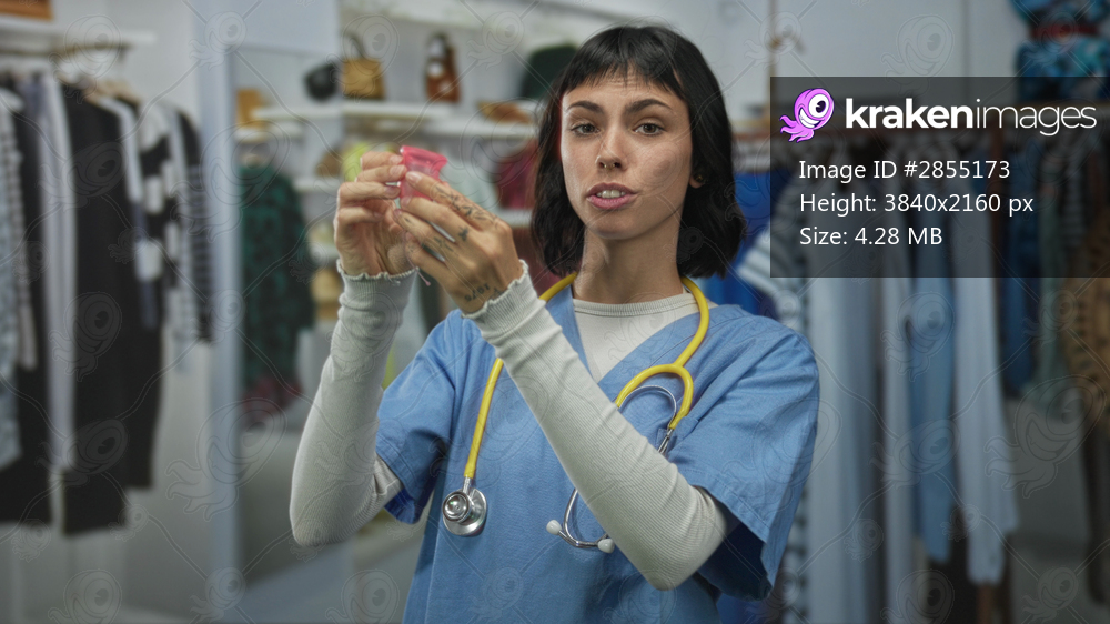 Woman nurse holds a pink menstrual cup in a retail store building demonstrating its use and smiling; empowerment awareness.