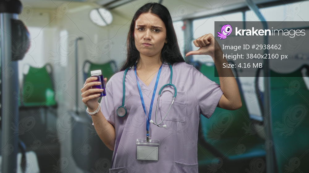 Woman nurse holds medicine bottle and gives thumbs down gesture in building wearing scrubs and stethoscope and badge lanyard; safety concern.