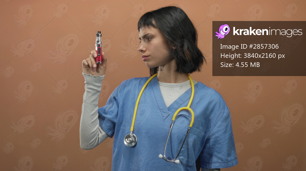 Woman nurse holds vape device and points finger upward in orange studio; concern warning health risk.