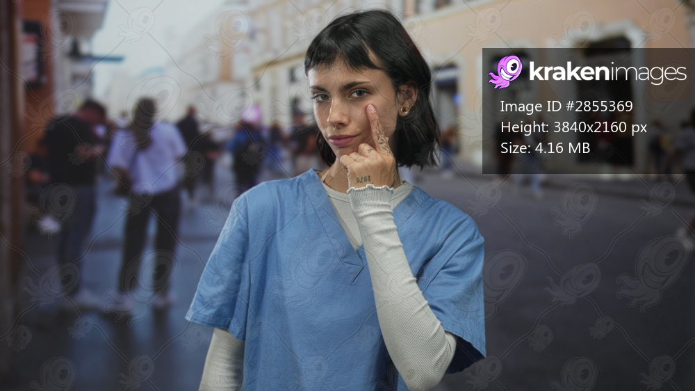 Woman nurse in blue medical scrubs points finger to cheek amid blurred urban pedestrians on bustling street; confidence.