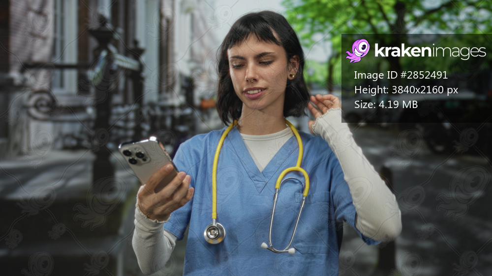 Woman nurse in blue scrubs holds smartphone and touches forehead at street; digital technology challenge stress.