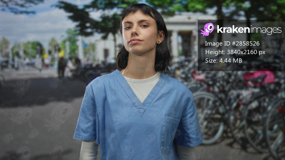 Woman nurse in blue scrubs points finger to cheek on shaded amsterdam street with parked bicycles; confidence.