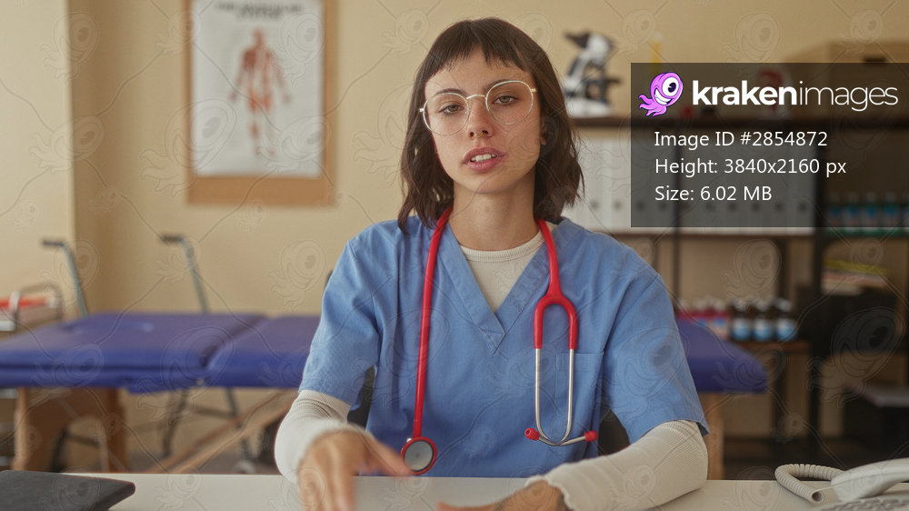 Woman nurse in blue scrubs with stethoscope gestures with hands while speaking in building; concentration.