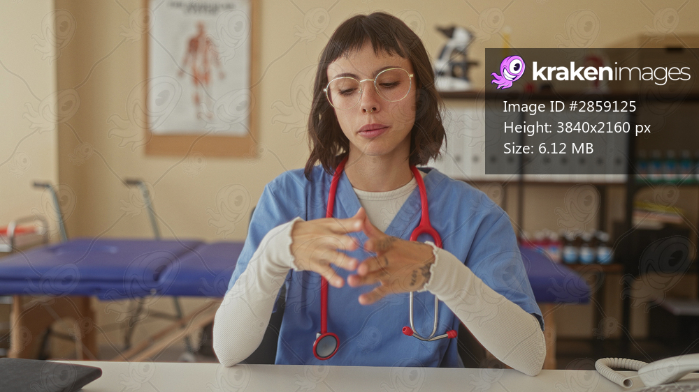 Woman nurse in blue scrubs with stethoscope gestures with hands while speaking in building; concentration.