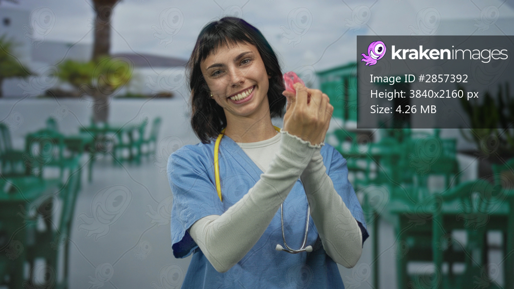 Woman nurse in blue scrubs with stethoscope holding menstrual cup with her hands on a restaurant terrace by a building; empowerment confidence awareness selfcare. - Kraken Images