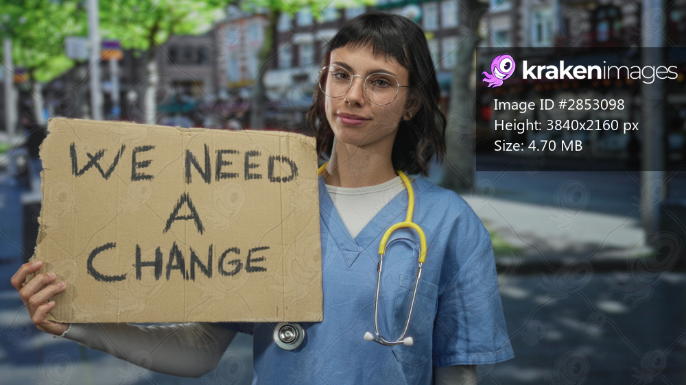 Woman nurse in blue scrubs with stethoscope holds a cardboard protest sign on an urban street; solidarity.