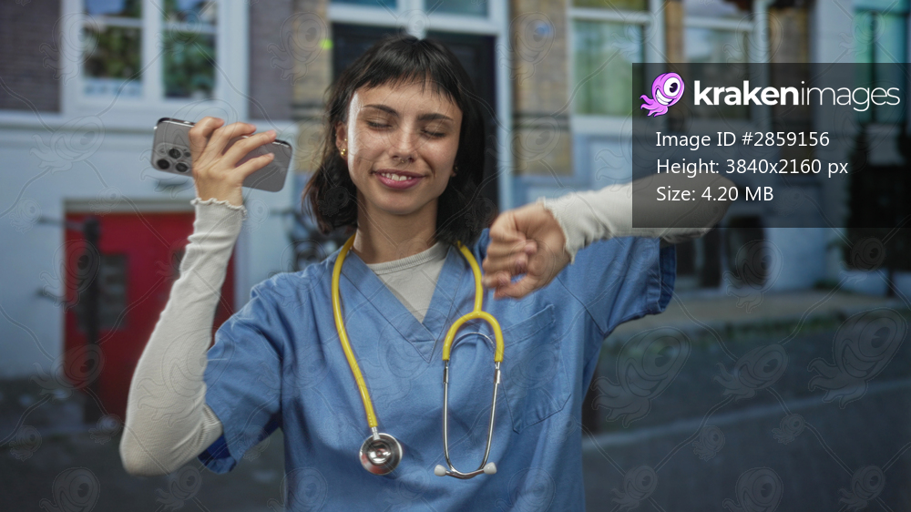 Woman nurse in blue scrubs with yellow stethoscope holding smartphone to ear on urban street; empathy compassion joy.