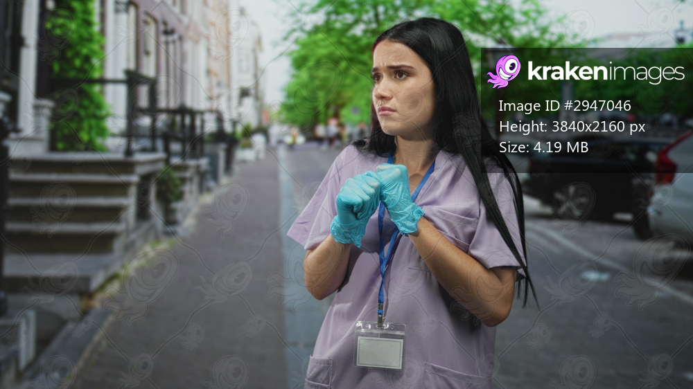 Woman nurse in lavender scrubs clasping gloved hands over chest wearing badge while looking uneasy on street; anxiety vulnerability.