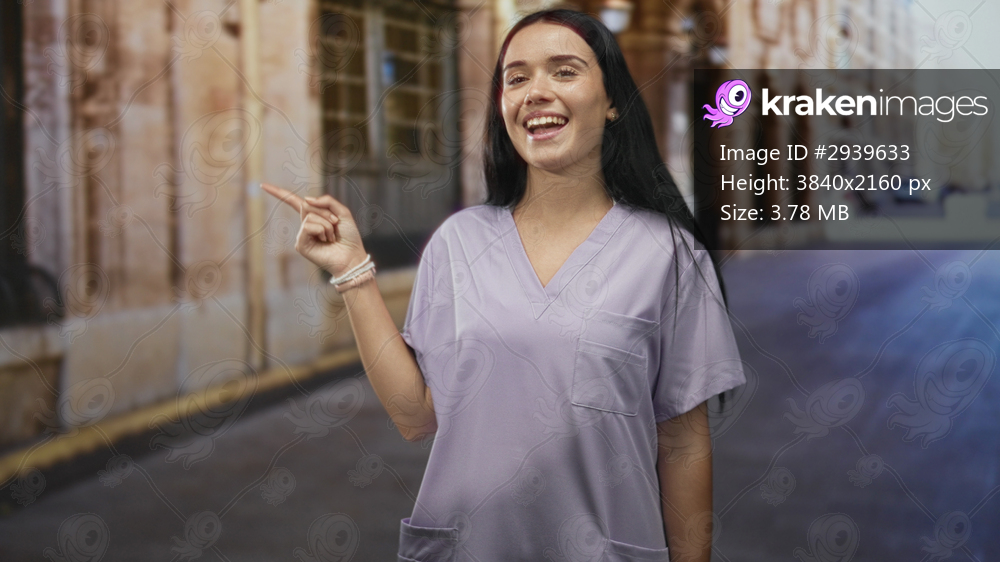 Woman nurse in lilac scrubs points finger and smiles on a sunlit street with stone building facade in view; compassion confidence.