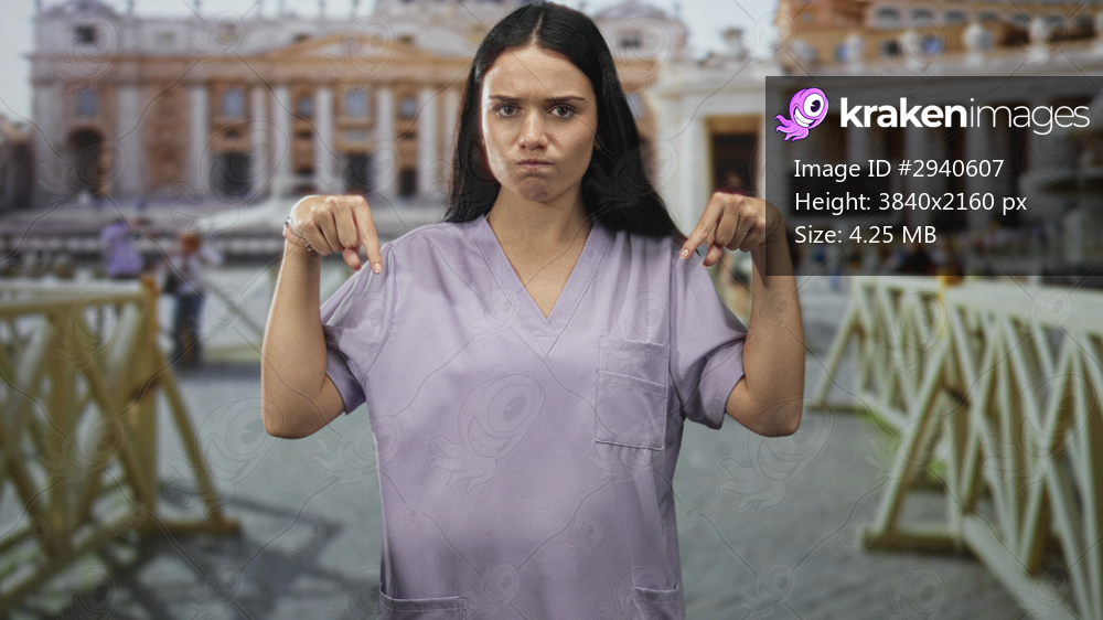 Woman nurse in purple scrubs points fingers down at building entrance with stern expression and visible pocket; frustration defiance.