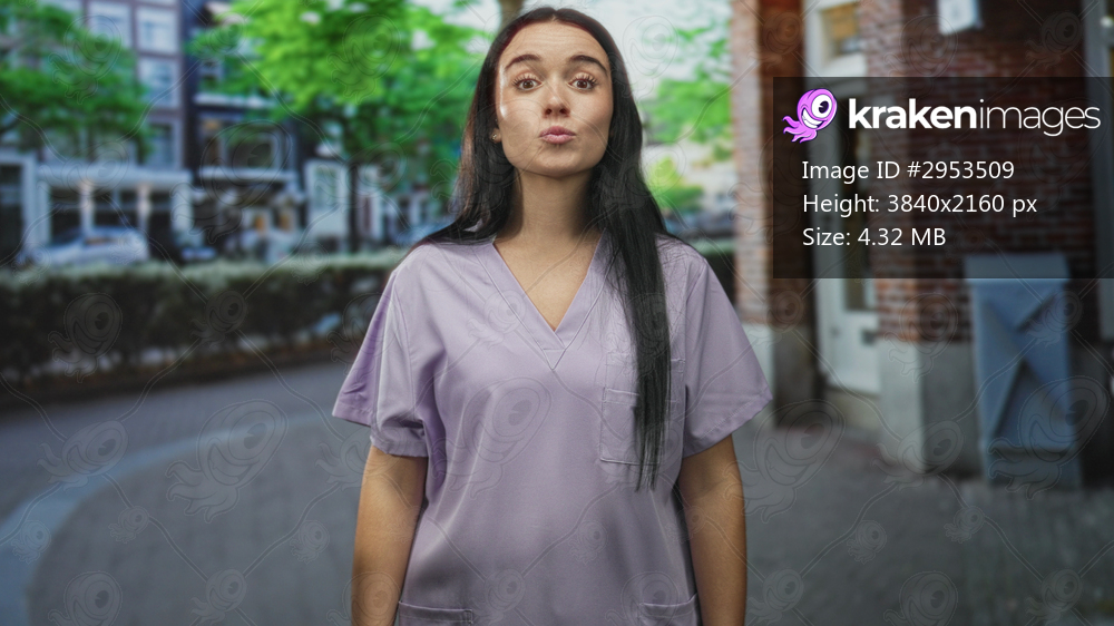 Woman nurse in purple scrubs smiling and making a finger heart gesture with her fingers on a city street by a brick building and bicycle lane; compassionate care. - Kraken Images