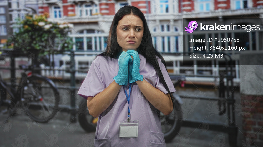 Woman nurse in scrubs clasps blue gloves to chest with visible id badge on street by bicycles and canal; anxiety caring.