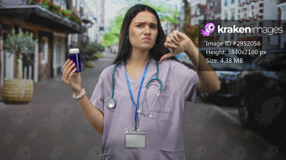 Woman nurse in scrubs holds a medicine bottle with hands and gives thumbs down on a street lined with parked cars; safety concern.