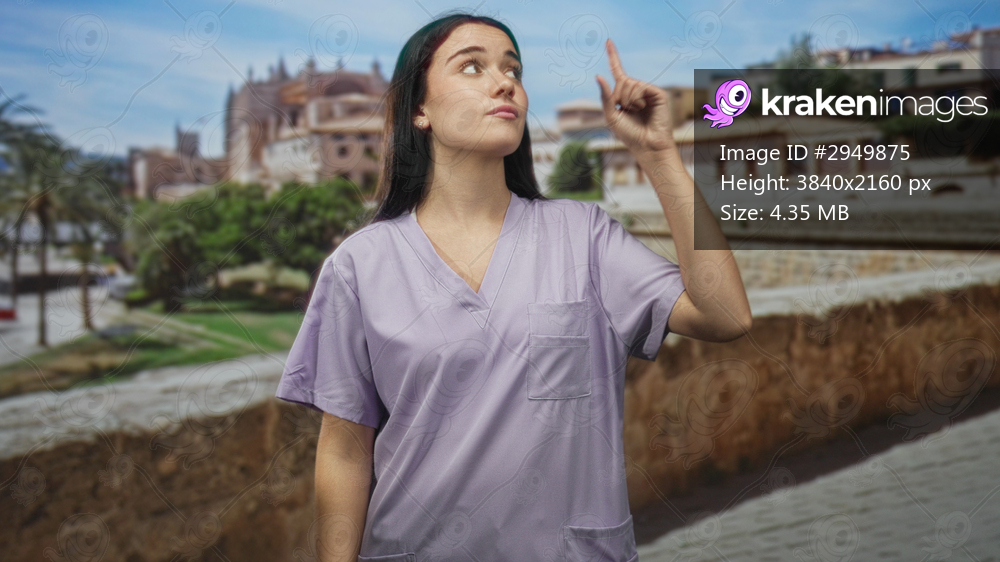 Woman nurse in scrubs smiling and giving thumbs up on a street by a stone wall and historic building with palm trees visible; confidence care.