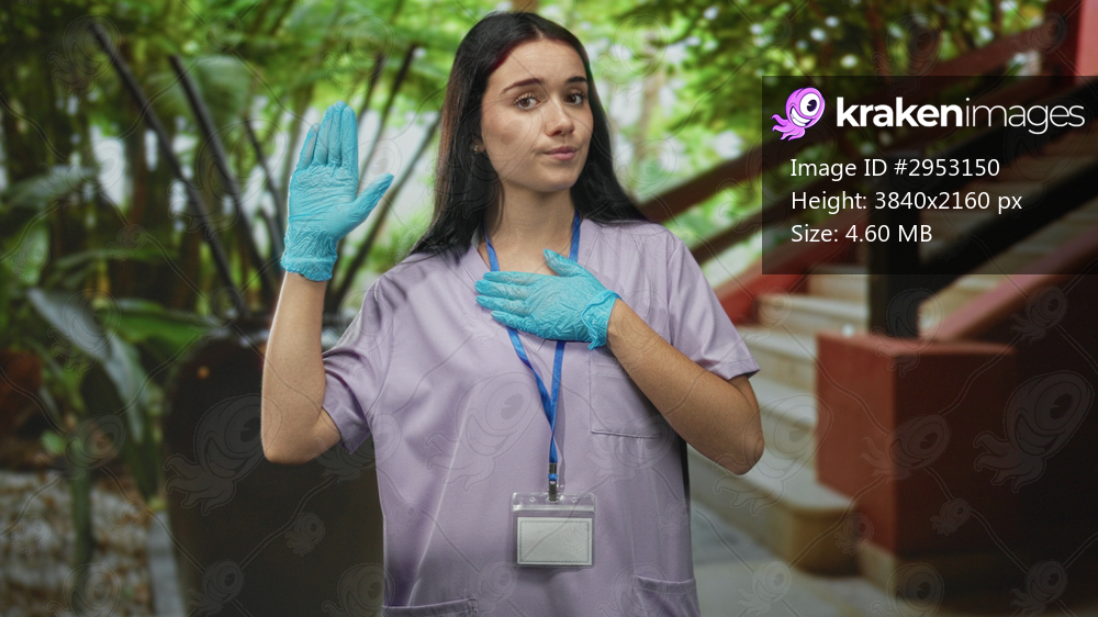 Woman nurse in scrubs wearing blue gloves raises right hand and places left hand on chest in a building; duty.